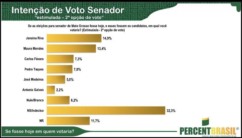A deputada estadual Janaina Riva (MDB) lidera a intenção de segundo voto ao Senado em Mato Grosso, segundo levantamento da Percent, realizado entre os dias 9 e 17 de fevereiro em todo o estado. No cenário estimulado para a segunda opção de voto, Janaina registra 14,9% das intenções, à frente do governador Mauro Mendes, que aparece com 13,4%.